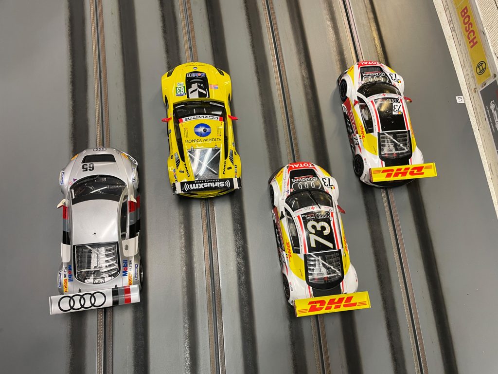 Diesmal konnte ich kein Polster auf Markus herausfahren wie im vergangenen Scaleauto-Rennen. Wieder kam im letzten Lauf auf der Spur1 der Einbruch: über sechs Sekunden (0,61 Runden) verliert Lutz auf Markus, der sich den dritten Platz erkämpft.