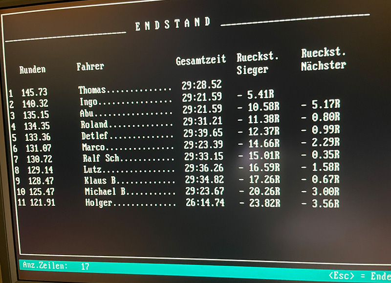 Im Rennen selbst raste Thomas R. mit einem Ford Escort zum Sieg mit 145.73 Runden nach 30 Minuten. Ingo folgte mit bereits fünf Runden Rückstand und Abu überraschte mit einem 3. Platz.